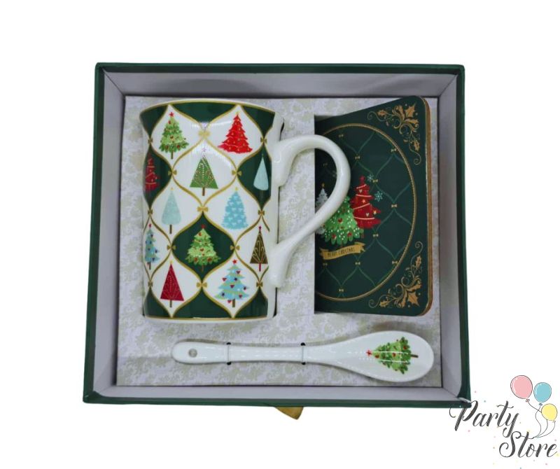 Коледен комплект чаша с подложка и лъжичка в подаръчна кутия – 16x8x18 см