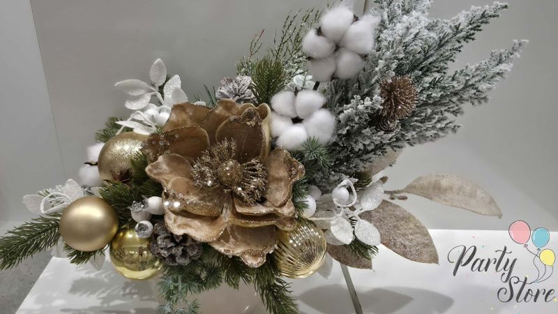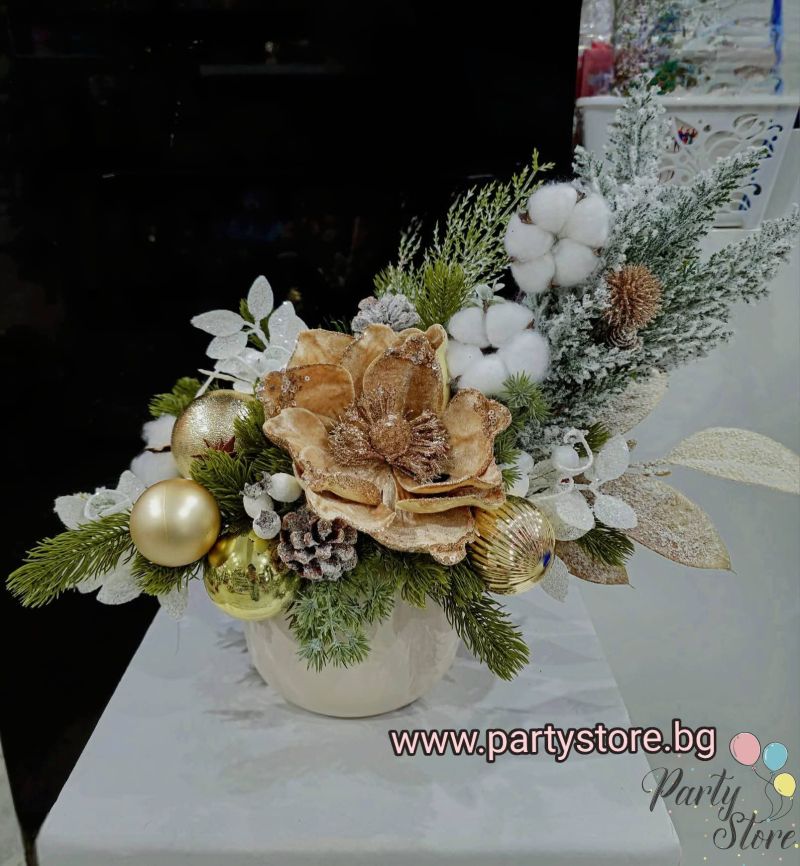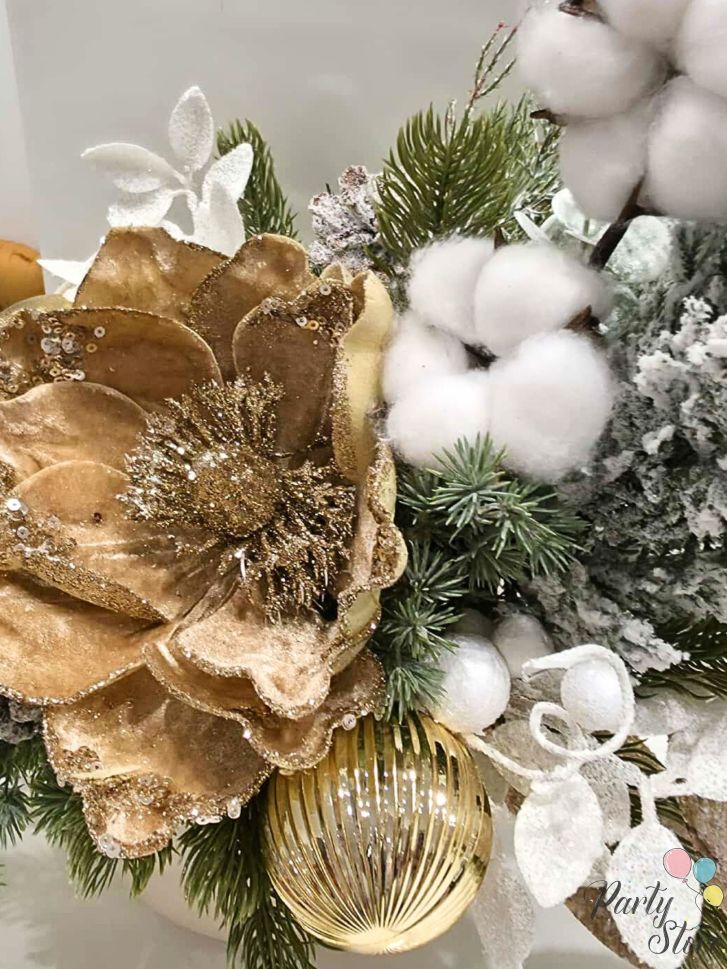 Луксозна коледна аранжировка с велурени цветя, памук и златни акценти