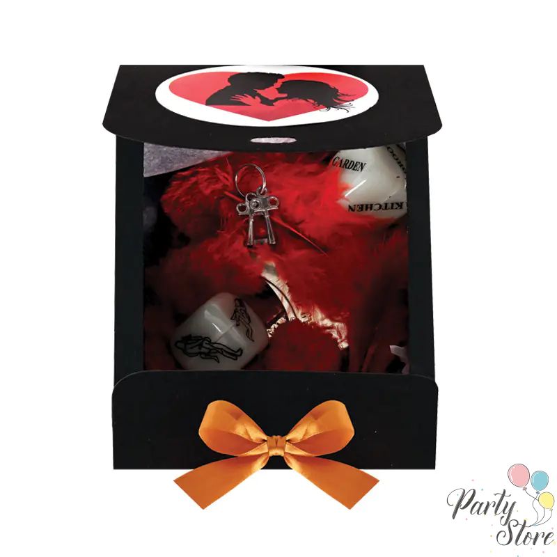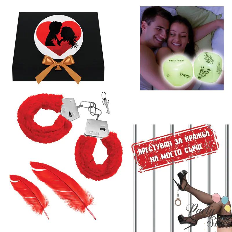 Kомплект "Арестуван за кражба на моето сърце!" с белезници, зарчета и перца