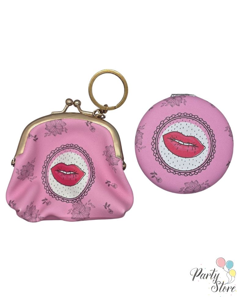 Дамски Комплект „Целувка“ – Розово Портмоне и Огледалце