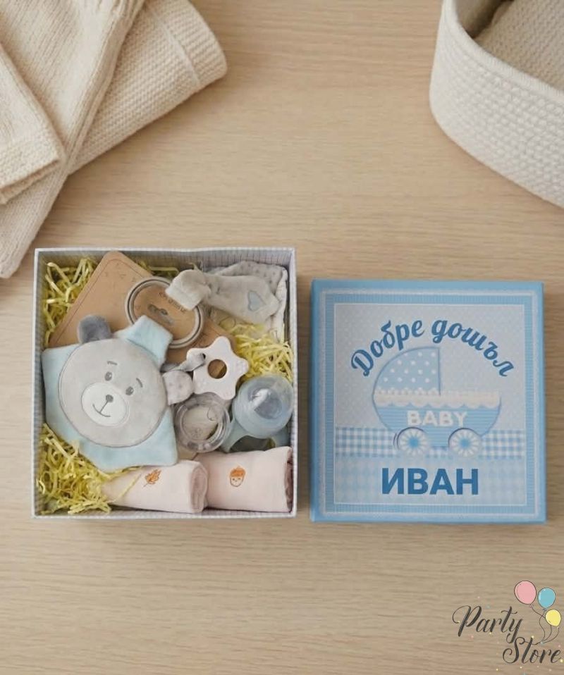 Подаръчен комплект, предназначен за новородени бебета (момчета). Идеален избор за покупка от роднини, приятели и колеги, които търсят готов подарък за събития като: изписване от родилно отделение, бебешка погача, кръщене или първо посещение в дома на бебето.