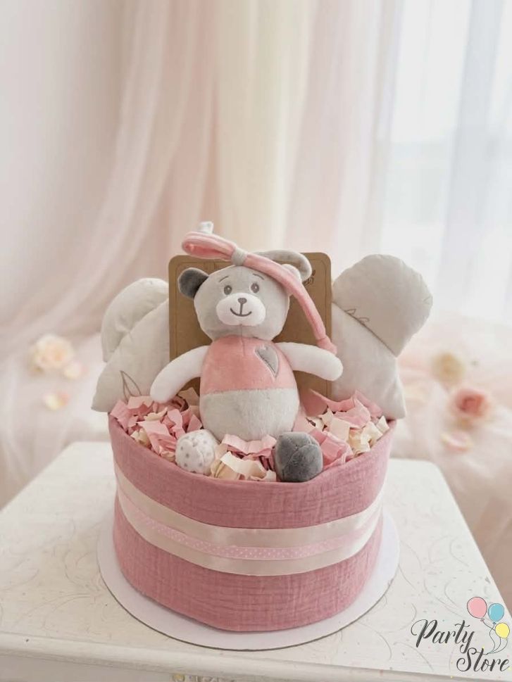 Премиум подаръчен комплект, оформен като торта от памперси, предназначен за новородени бебета (момичета). Идеален за клиенти, които търсят ефектен, обемен и напълно завършен подарък за събития като: изписване от родилен дом, бебешка погача или първо посещение при новородено.