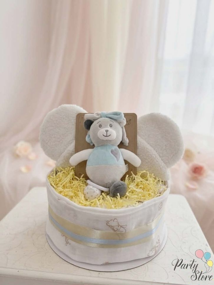 Премиум подаръчен комплект във формата на торта от памперси, предназначен за новородени бебета (момчета). Идеален избор за роднини, приятели и колеги, които търсят обемен, практичен и готов за подаряване сет за бебешка погача, изписване от родилен дом или първо гостуване.