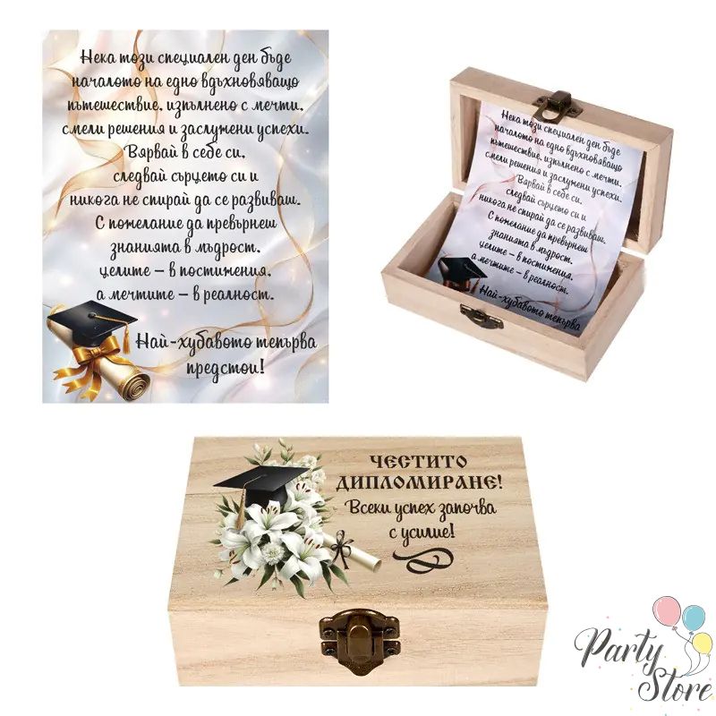 Дървена подаръчна кутия за пари „Честито дипломиране!“ с бели лилии и пожелание